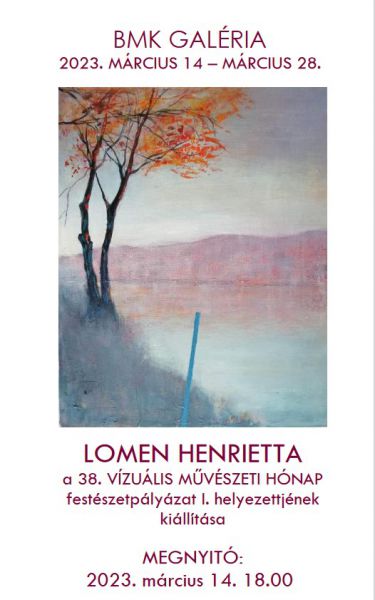 A Budapesti Művelődési Központ tisztelettel meghívja Önt és barátait a 2022. évi 38. Vizuális Művészeti Hónap I. díjazottjának, Lomen Henrietta kiállításának megnyitójára a BMK Galériába.